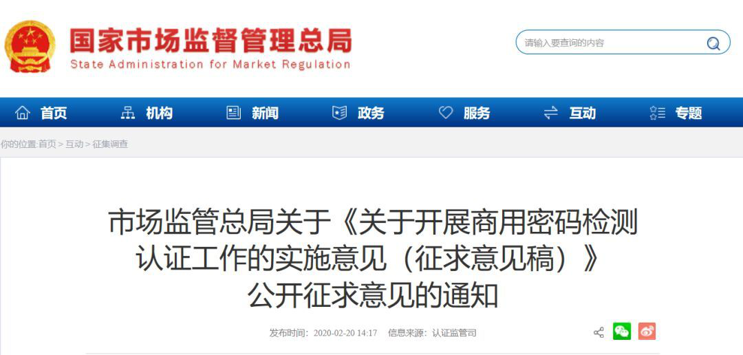 據該通知,為推進商用密碼檢測認證體系建設,促進商用密碼產業(yè)健康有序發(fā)展,根據《中華人民共和國產品質量法》《中華人民共和國密碼法》和《中華人民共和國認證認可條例》,市場監(jiān)管總局、國家密碼管理局聯合起草了《關于開展商用密碼檢測認證工作的實施意見(征求意見稿)》,現正向社會公開征求意見。各有關單位或個人提出修改意見,可于2020年3月6日前反饋市場監(jiān)管總局。