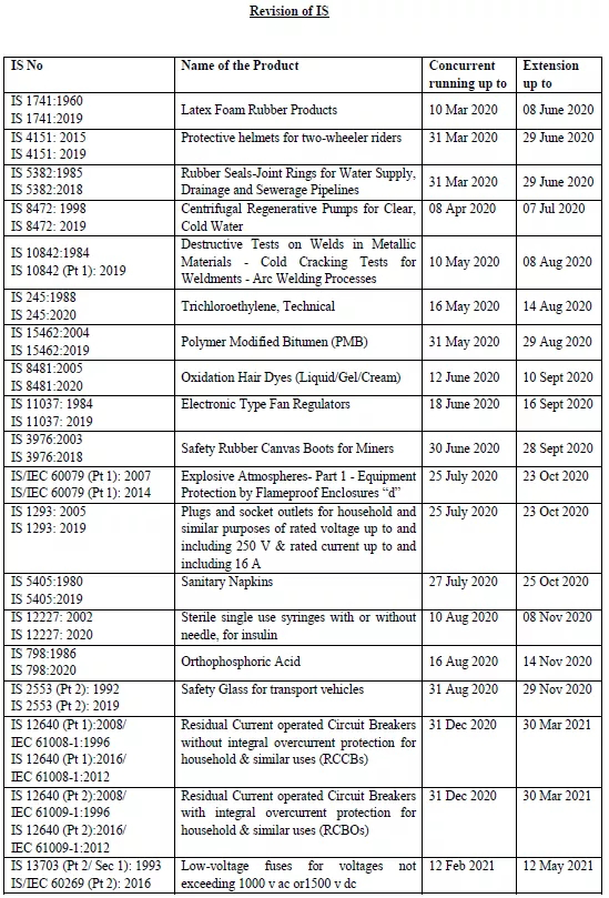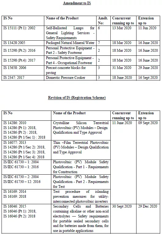 另外,印度中央標準局于2020年3月27日發(fā)布通知,由于受疫情影響, 將推后原本將于2020年3月1日及之后強制執(zhí)行的新版IS標準,由原定執(zhí)行日期起推遲90天,詳情如下: