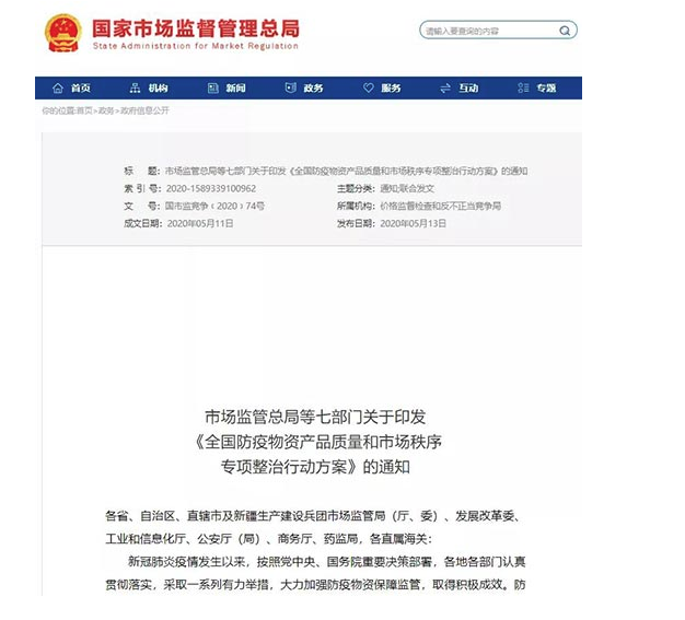 近日,為加強(qiáng)對(duì)防疫物資產(chǎn)品的質(zhì)量監(jiān)管,維護(hù)市場(chǎng)秩序,市場(chǎng)監(jiān)管總局、國(guó)家發(fā)展改革委、工業(yè)和信息化部、公安部、商務(wù)部、海關(guān)總署、藥監(jiān)局七部門聯(lián)合開展全國(guó)防疫物資產(chǎn)品質(zhì)量和市場(chǎng)秩序?qū)m?xiàng)整治行動(dòng)。于2020年05月13日,印發(fā)了《全國(guó)防疫物資產(chǎn)品質(zhì)量和市場(chǎng)秩序?qū)m?xiàng)整治行動(dòng)方案》的通知。