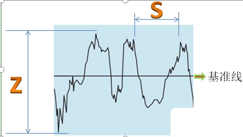 我們一般評(píng)價(jià)粗糙度會(huì)有基準(zhǔn)線,基準(zhǔn)線以上最高點(diǎn)我們叫波峰點(diǎn),基準(zhǔn)線以下最低點(diǎn)叫波谷點(diǎn),那么波峰和波谷之間的高度我們用Z來表示,加工產(chǎn)品的微觀紋理的間距我們用S來表示。