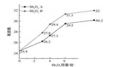 然而,并不是電纜材料中三氧化二銻的含量越高就越好,在符合正常的標(biāo)準(zhǔn)后還是要考慮成本的。電纜的抗燃燒性通常用氧指數(shù)來(lái)表現(xiàn),氧指數(shù)越高就說明抗燃燒性越高,上面圖像就是兩種三氧化二銻的含量與氧指數(shù)的關(guān)系圖,當(dāng)三氧化二銻到一定含量之后氧指數(shù)增長(zhǎng)就已經(jīng)減緩,因此考慮成本的前提下,可以適當(dāng)調(diào)整三氧化二銻的含量。