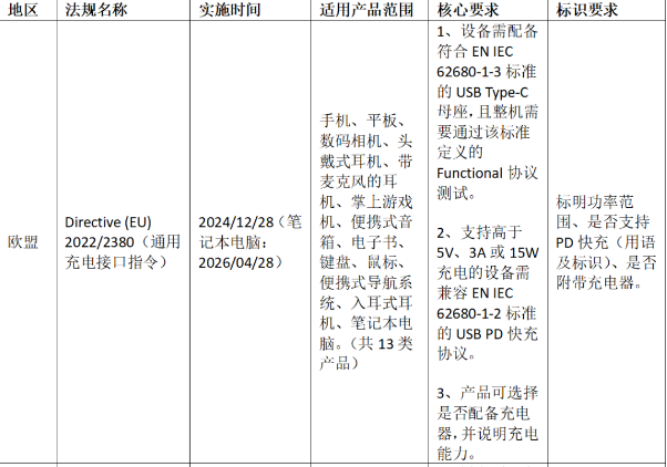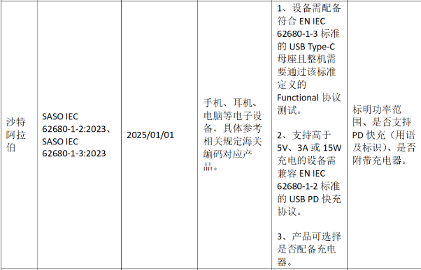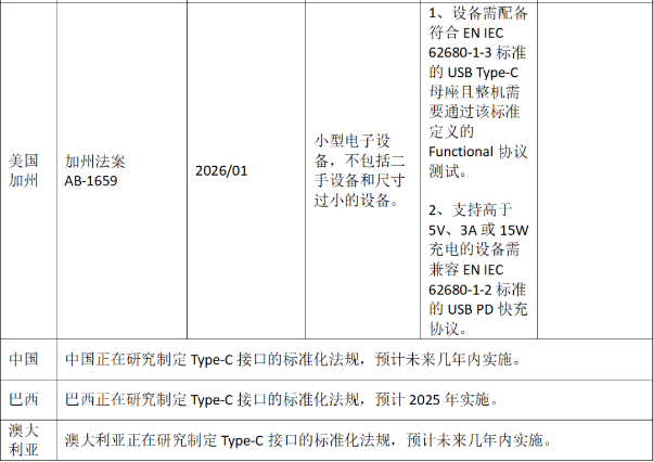 沙特阿拉伯、美國加州、印度等國家和地區(qū)也已出臺(tái)相關(guān)法律法規(guī),明確實(shí)施時(shí)間和要求。各國對(duì)Type-C充電器的法規(guī)要求整理如下: