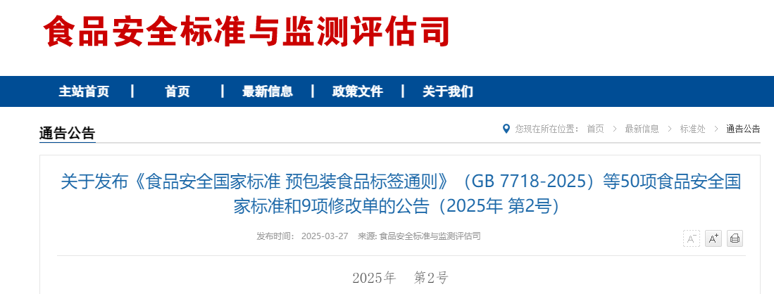 根據(jù)《食品安全法》規(guī)定,國(guó)家衛(wèi)生健康委、市場(chǎng)監(jiān)管總局聯(lián)合印發(fā)2025年第2號(hào)公告,發(fā)布50項(xiàng)新食品安全國(guó)家標(biāo)準(zhǔn)和9項(xiàng)修改單。主要包括:《預(yù)包裝食品標(biāo)簽通則》等2項(xiàng)食品標(biāo)簽標(biāo)準(zhǔn)、《嬰幼兒谷類(lèi)輔助食品》等3項(xiàng)特殊膳食食品標(biāo)準(zhǔn)、《發(fā)酵乳》等4項(xiàng)食品產(chǎn)品標(biāo)準(zhǔn)、《調(diào)制肉制品生產(chǎn)衛(wèi)生規(guī)范》等3項(xiàng)生產(chǎn)經(jīng)營(yíng)規(guī)范標(biāo)準(zhǔn)、《消毒劑》1項(xiàng)食品相關(guān)產(chǎn)品標(biāo)準(zhǔn)、《食品營(yíng)養(yǎng)強(qiáng)化劑?乙二胺四乙酸鐵鈉》等4項(xiàng)食品營(yíng)養(yǎng)強(qiáng)化劑質(zhì)量規(guī)格標(biāo)準(zhǔn)、《食品添加劑?葉黃素》等4項(xiàng)食品添加劑質(zhì)量規(guī)格標(biāo)準(zhǔn)、《食品安全國(guó)家標(biāo)準(zhǔn) 食品微生物學(xué)檢驗(yàn) 大腸菌群計(jì)數(shù)》等29項(xiàng)檢驗(yàn)方法標(biāo)準(zhǔn),以及《滅菌乳》等9項(xiàng)修改單。