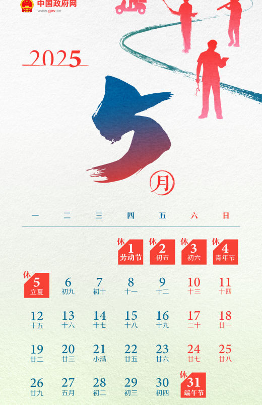 5月1日(周四)至5日(周一)放假調(diào)休,共5天。