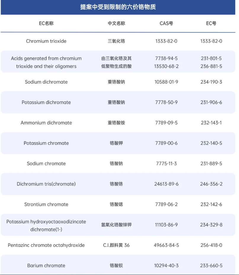 此次提案中受到限制的六價鉻物質(zhì)如下表所示,需注意下列物質(zhì)的結(jié)晶水形態(tài)也被納入其中。