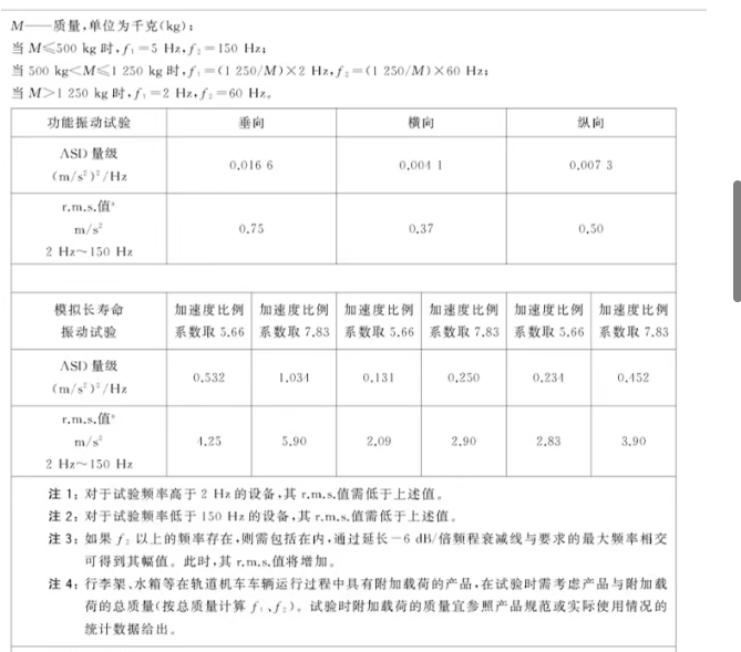 ——功能振動試驗,施加最小的試驗量級,驗證被測設備在軌道機車車輛上可能的環(huán)境條件下能否正常工作,是否滿足制造商和用戶的雙方性能需求;——模擬長壽命試驗:證實在加速運行振動量級條件下設備機械結構的完好性,在試驗時候不必檢查設備的功能。