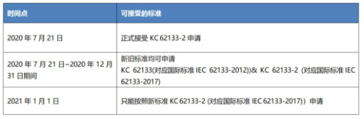 2020年7月21日,韓國(guó)技術(shù)標(biāo)準(zhǔn)局KATS(Korean Agency for Technology and Standards)發(fā)布新通知:KC 62133-2 正式確認(rèn)并開(kāi)始使用。其對(duì)應(yīng)的國(guó)際標(biāo)準(zhǔn)IEC 62133-2012版和IEC 62133-2017版的CB報(bào)告及證書(shū)在2020年12月31前均可以被接受用于KC轉(zhuǎn)證。具體時(shí)間點(diǎn):