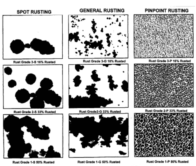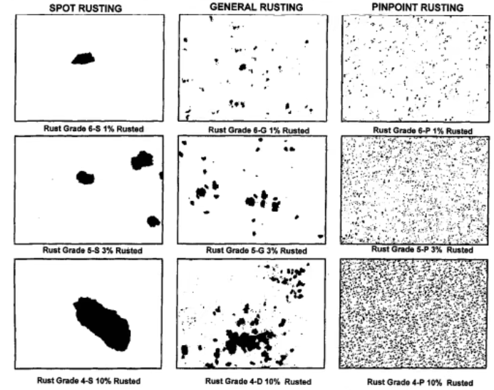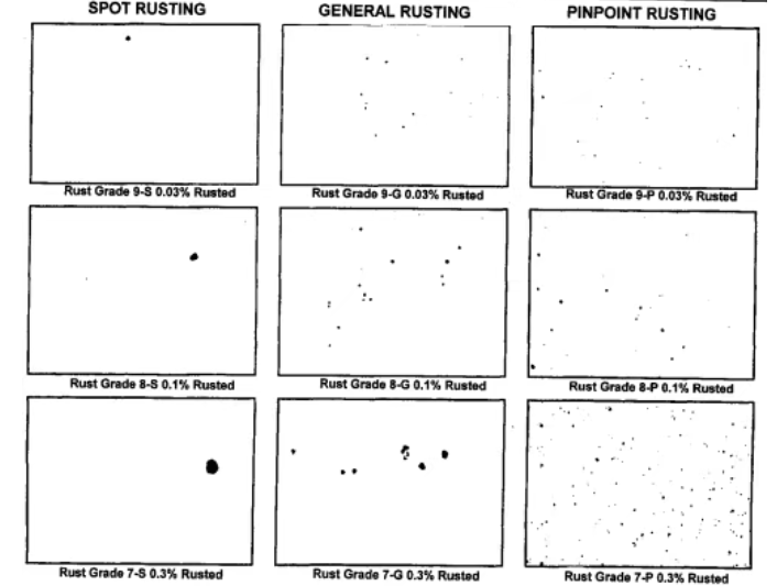 點(diǎn)狀(Spot):試件表面的少數(shù)區(qū)域出現(xiàn)較大的點(diǎn)狀生銹。片狀(General):試件表面的較大面積的片狀生銹。微小點(diǎn)狀(Pinpoint):試件表面散布的極細(xì)小的斑點(diǎn)狀生銹?;旌闲?Hybrid):包括點(diǎn)狀、片狀、微小點(diǎn)狀幾種現(xiàn)象同時(shí)存在的生銹