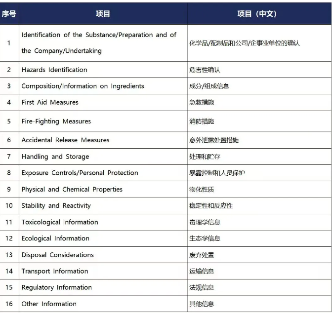 MSDS有規(guī)定格式和標(biāo)準(zhǔn)依據(jù),不同國家有不同的MSDS標(biāo)準(zhǔn),常規(guī)MSDS一般包括16項: