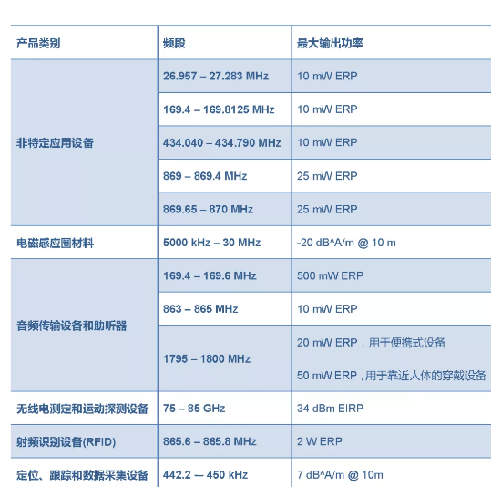 近期,摩洛哥國家電信管理局(ANRT)發(fā)布了一項(xiàng)新的短距離無線通信設(shè)備(SRD)規(guī)定ANRT/DG/N°07/2020。新規(guī)定為SRD設(shè)備的各種使用場景提供了額外的頻段,例如大功率射頻識別,其他技術(shù)要求保持不變。新增的頻段及其最大輸出功率限制如下: