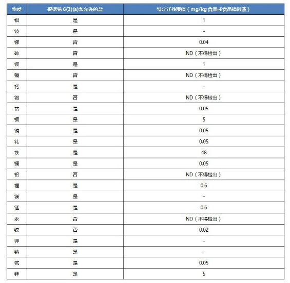 以下是關(guān)于上表1的一些要點:重金屬特定遷移的元素種類從原有的9種(鋇、鈷、銅、鐵、鋰、錳、鋅、鋁、鎳限值不變)增至24種(新增銨、銻、砷、鎘、鈣、鉻、銪、釓、鑭、鉛、鎂、汞、鉀、鈉、鋱),其中4種鑭系元素(銪、釓、鑭、鋱)的限值為0.05mg/kg,砷、鉻、鉛、汞的限值為不得檢出(0.01mg/kg),鎘為不得檢出(0.002mg /kg),其他元素沒有限值要求。