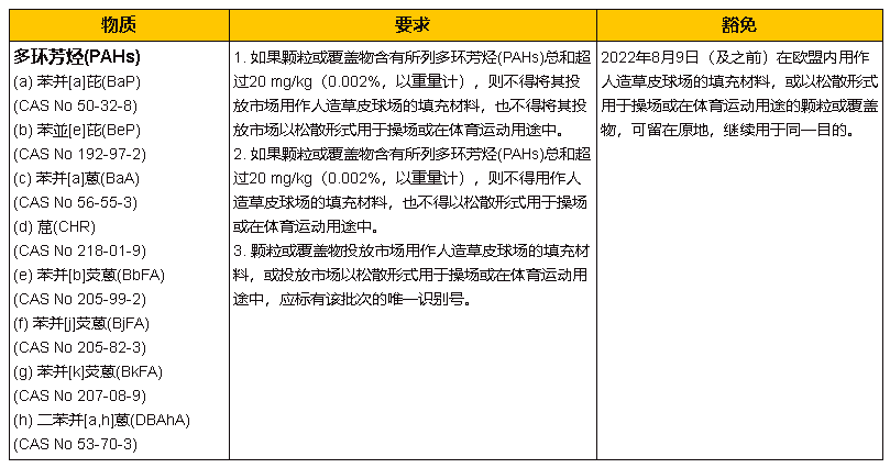 2021年7月21日,歐盟委員會發(fā)布了法規(guī)(EU) 2021/1199,修訂REACH法規(guī)(EC) No 1907/2006附錄XVII第50項,新增限制用作人造草皮球場的填充材料、以松散形式用于操場或在體育運動用途中的顆粒和覆蓋物中8種多環(huán)芳烴(PAHs)的含量。該修訂將于2021年8月10日生效,并將從2022年8月10日起實施。 以下為修訂的詳細內容: