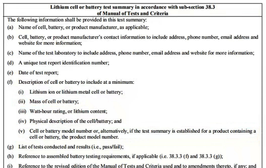 關(guān)于鋰電池檢測(cè)的第38.3章節(jié)的部分內(nèi)容修訂有兩處: "i驗(yàn)概要Lithium cell and battery testsummary" 中: 38.3.5()(i)原"質(zhì)量(Mass) "更改為“電池或電池組質(zhì)量(Mass of cell orbattery) ";