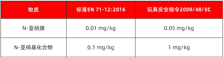 注:標(biāo)準(zhǔn)EN 71-12:2016中第4.2條表2第a點(diǎn)中的限值(即針對(duì)意圖供36個(gè)月以下兒童使用,且意圖或可能放入口中的彈性體玩具的限值)低于玩具安全指令2009/48/EC附件II第III部分第8點(diǎn)中規(guī)定的符合的限值。這些限值具體如下: