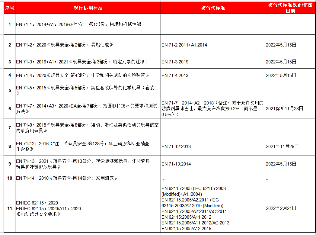 2021年11月16日,歐盟委員會(huì)發(fā)布了執(zhí)行決議(EU) 2021/1992,更新玩具安全指令2009/48/EC協(xié)調(diào)標(biāo)準(zhǔn),涉及EN 71-2、EN 71-3、EN 71-4和EN 71-13四項(xiàng)標(biāo)準(zhǔn)。新的協(xié)調(diào)標(biāo)準(zhǔn)自發(fā)布即日起正式生效,先前版本將于2022年5月15日撤回。這意味著,2021年11月16日開(kāi)始,以上四項(xiàng)新版標(biāo)準(zhǔn)正式成為玩具安全指令的協(xié)調(diào)標(biāo)準(zhǔn),并于2022年5月15日全面取代舊版標(biāo)準(zhǔn)